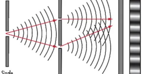 На левом рисунке показан ход лучей света, когда открыта одна щель (лучи изображены чёрным цветом). На правом рисунке показаны лучи света, когда открыты обе щели (лучи света от второй щели изображены красным цветом, а от первой щели лучи изображены также черным цветом). Рисунок выполнен в масштабе 1:10, поэтому щели размером в несколько микрон, и перегородка между ними размером в несколько десятых миллиметра при строгом соблюдении масштаба, практически сливаются вместе в одну точку.