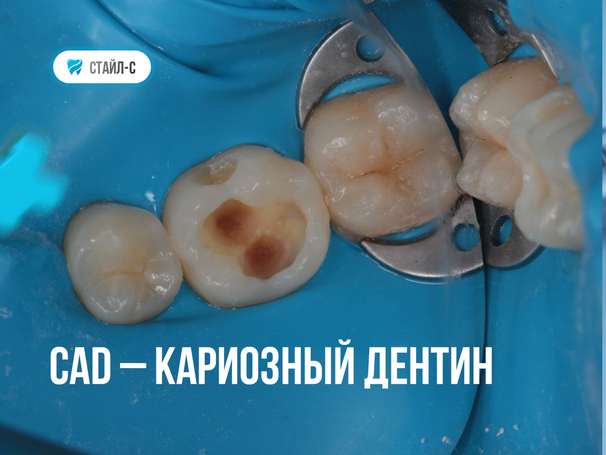 На этом фото, недавно сделанном в нашей клинике — классический этап лечения глубокого кариеса. Зуб качественно изолирован от полости рта синим платком (это коффердам), что обеспечивает стерильность. В центральном зубе мы видим подготовленную полость, на дне которой — потемневшая ткань. Это и есть кариозный дентин. Часто пациенты, заглядывая в зеркало во время лечения, пугаются, увидев темное пятно на дне полости, как на этом фото. Сразу возникает мысль: «Доктор, вы оставили кариес!». Поэтому сегодня мы расскажем подробнее об этой ситуации и что такое CAD — Caries Affected Dentin. Дентин — это основная ткань зуба, находящаяся под эмалью. Когда кариес ее поражает, дентин меняется. И тут важно различать два его состояния: 1. Внешний (инфицированный) слой: это мягкая, влажная, необратимо разрушенная ткань, пропитанная бактериями. Ее необходимо полностью и безжалостно убирать, так как она лишь является источником инфекции. 2. Внутренний (пораженный) слой, или CAD: находится глубже, он более