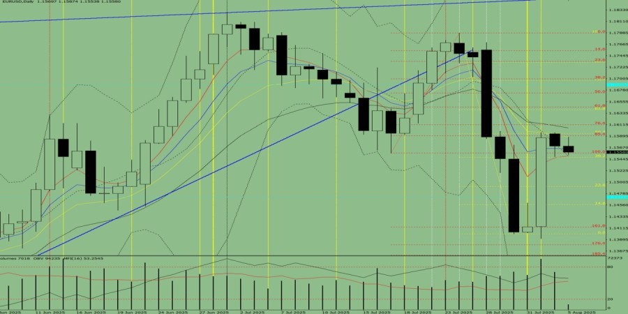 https://basechop.ru/wordpress/?p=52547 Трендовый анализ (рис. 1). Во вторник рынок, от уровня 1.1570 (закрытие вчерашней дневной свечи), может продолжить движение вниз, с целью 1.1549 – откатный уровень 38.2% – 1.1549 (жёлтая пунктирная линия). При тестировании этого уровня цена, возможно, откатит вверх, с целью тестирования откатного уровня 76.4% – 1.1611 (красная пунктирная линия). Рис. 1 (дневной график). Комплексный анализ: – индикаторный анализ – вниз; – объёмы – вниз; – свечной анализ – вниз; – трендовый анализ – вниз; – линии Боллинджера – вниз; – недельный график – вниз. Общий вывод: нисходящая тенденция. Альтернативный сценарий: цена от уровня 1.1570 (закрытие вчерашней дневной свечи), может продолжить движение вниз, с целью 1.1519 – нижний фрактал (дневная свеча от 29.07.2025 года). При тестировании этого уровня цена, возможно, откатит вверх, с целью тестирования откатного уровня 76.4% – 1.1611 (красная пунктирная линия). Материал предоставлен компанией InstaForex – www