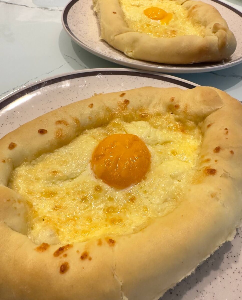 🧀 Хачапури по-аджарски 🛒 Ингредиенты (на 2 штуки): Для теста: • Мука — 250 г • Молоко тёплое — 100 мл • Вода тёплая — 50 мл • Сахар — 1 ч.л. • Соль — ½ ч.л. • Дрожжи сухие — 1 ч.л. (или 5 г свежих) • Масло сливочное — 30 г Для начинки: • Сулугуни — 150 г • Брынза — 100 г (или фета, или творог, если нет) • Яйца — 2 шт. • Сливочное масло — по 10 г в каждую лодочку ⸻ 🔪 Приготовление: 1. Замес теста 1. Смешай тёплое молоко, воду, сахар, дрожжи — оставь на 10 минут, пока вспенится. 2. Добавь соль, растопленное масло и просеянную муку. 3. Замеси мягкое эластичное тесто. Накрой и поставь в тёплое место на 1 час (должно увеличиться в 2 раза). 2. Подготовь начинку • Натри сыр (сулугуни + брынза), перемешай. Можно добавить чуть сливок или яичного белка — для пластичности. 3. Формовка 1. Раздели тесто на 2 части. Раскатай каждую в овал. 2. Заверни длинные края к центру, скрути концы — получится лодочка. 3. Выложи сырную начинку внутрь. 4. Выпечка • Выпекай при 220°C около 12–15 минут,