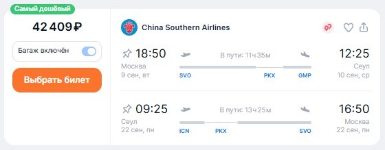 ✈️Москва - Сеул (Южная Корея), Пересадка в Пекине, туда и обратно, с багажом за 42400 рублей 9 сентября - 22 сентября - https://checkintime.ru/wuwd 🏖 Поиск туров | ✈️Авиабилеты