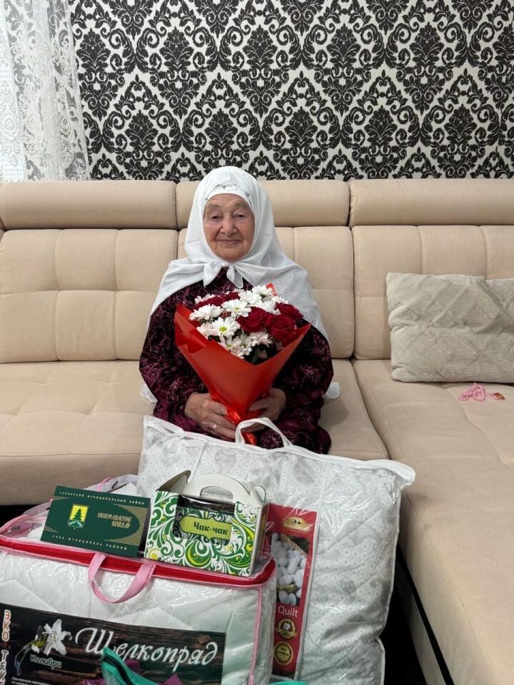 💐💐💐Сабада яшәүче Һаҗәр Фатыйхованы 90 яшьлек юбилее белән котларга район башлыгы исеменнән социаль яклау бүлеге начальнигы Лилия