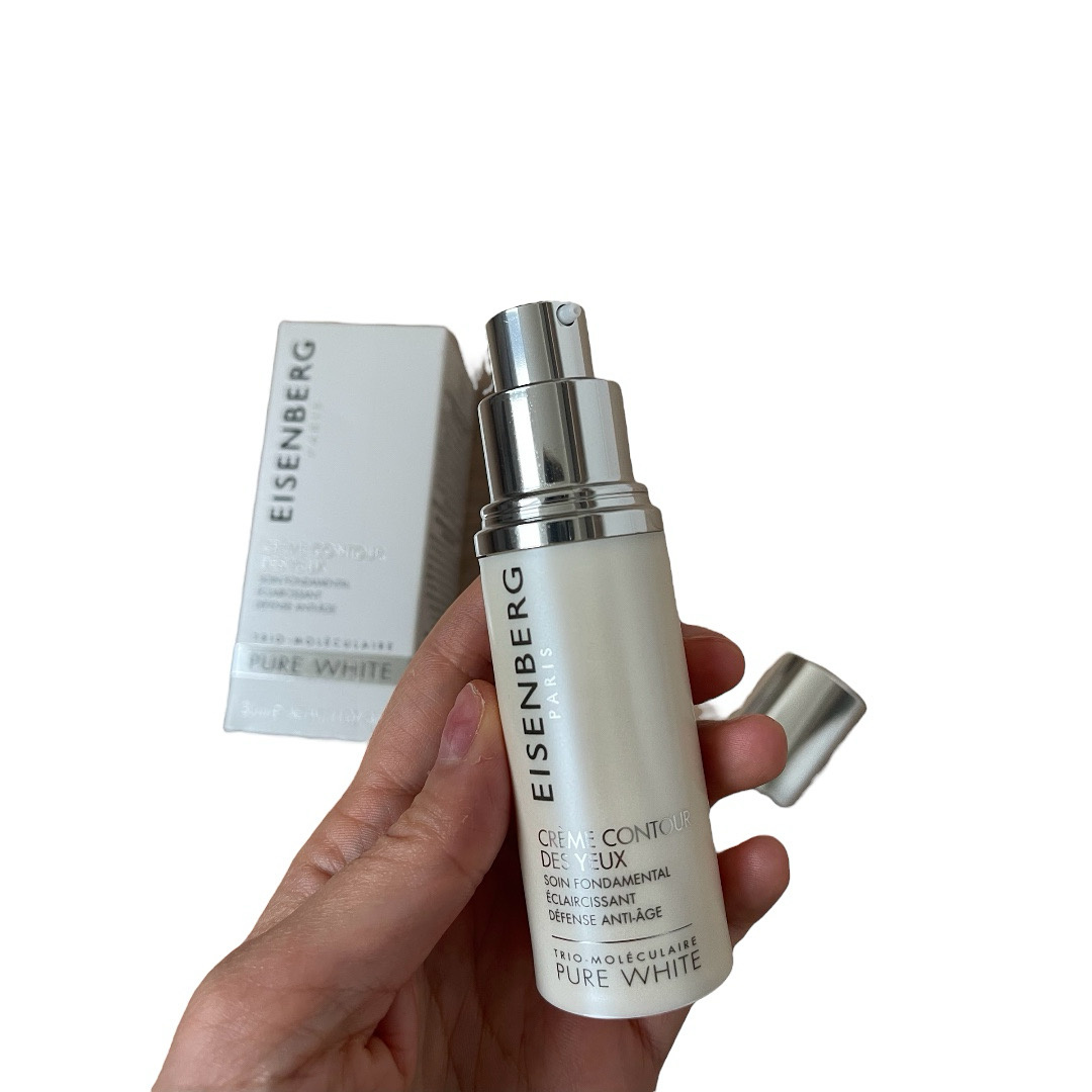 Сегодня на обзоре крем для контура глаз с осветляющим действием Eye contour cream Pure White от французского бренда Eisenberg. Упаковка-картонная коробочка с информацией, внутри описание и инструкция на разных языках и сам флакончик из белого перламутрового пластика с металической крышечкой и дозатором. Все выглядит добротно, дозатор исправно выдает средство. Объем 30 мл. Крем белого цвета, запах присутствует, но еле уловимый, его надо совсем чуть-чуть, текстура приятная, легкого крема, но он не очень хорошо распределяется, долго, но потом он приятно ощущается, увлажняет. Кожа становится более плотной, нет жирной пленки и парникового эффекта. Что касается осветления-сложно сказать, что там нужно осветлять. Крем комфортный. Не могу сказать, что он делает что-то сверхъестественное за свою цену, я его брала в Летуаль, стоит чуть больше 10 тыс руб, вряд ли я его повторю. Состав, кстати, не очень.