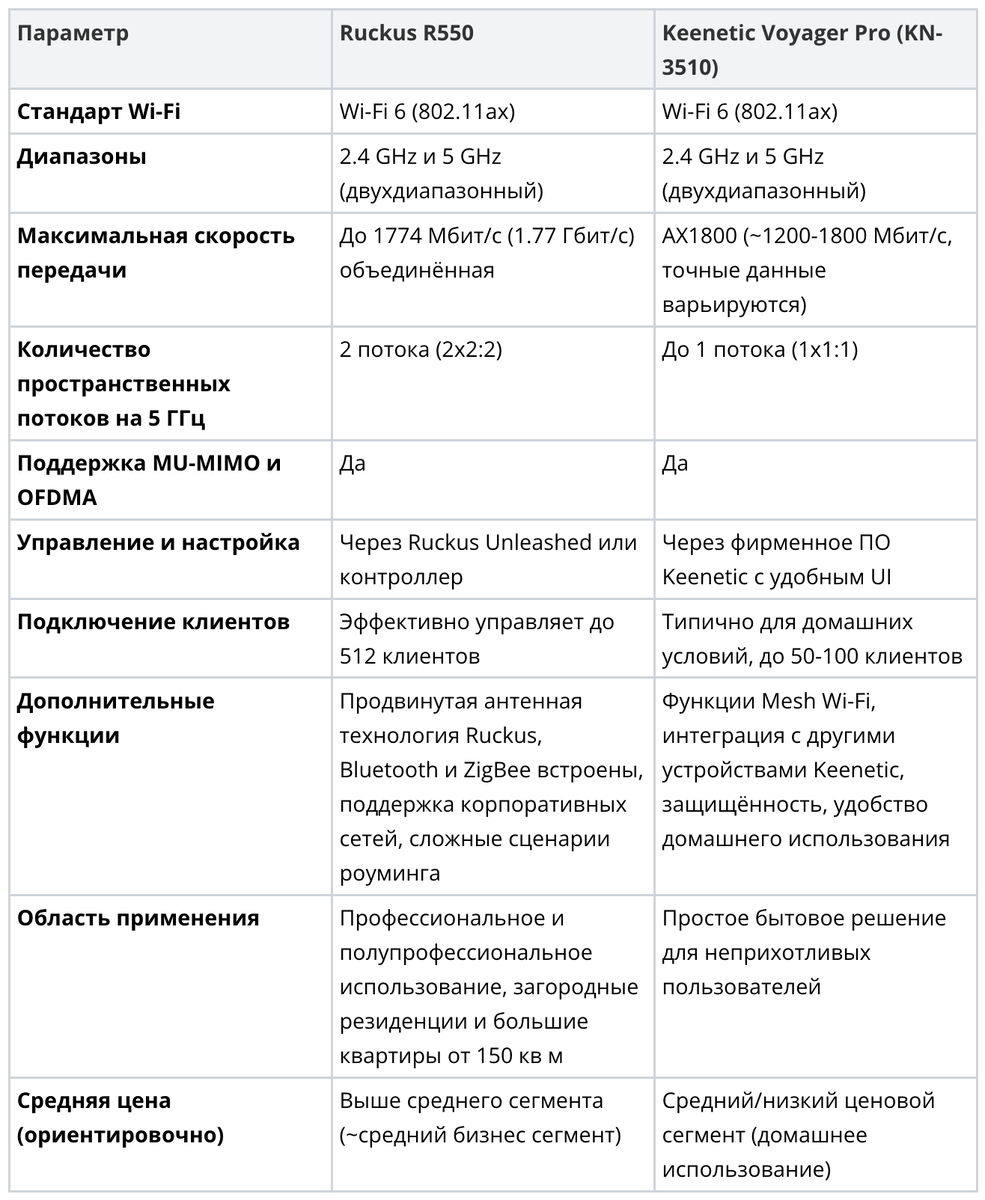 Выбор правильной точки доступа зависит от задач, которые вы планируете решать с помощью Wi-Fi сети. Обе модели — Ruckus R550 и Keenetic Voyager Pro — ориентированы на поддержку современного стандарта Wi-Fi 6 (802.11ax), но позиционируются в разных сегментах рынка: Ruckus R550 — скорее профессиональный среднебюджетный вариант, а Keenetic Voyager Pro — более доступное и простое устройство для домашнего использования. Ниже мы подробно рассмотрим их технические характеристики и особенности для выявления отличий и преимуществ.
