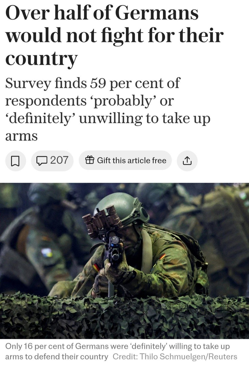 59% немцев не станут защищать ФРГ в случае вторжения — The Telegraph Встать под ружьё готовы только 16% граждан Германии. Ещё 22% заявили, что, «вероятно», сделают это, говорится в материале издания.