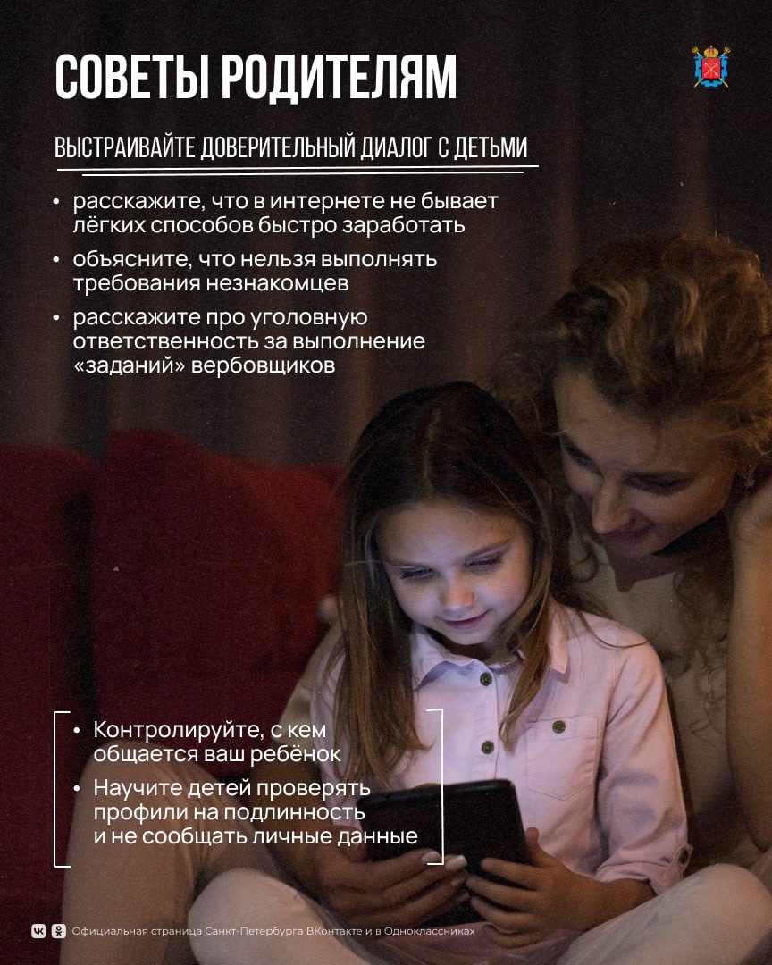 Как защитить ребёнка от онлайн-угроз? Обещание лёгких денег, шантаж, игра на чувстве значимости — эти приёмы используют преступники, чтобы вовлечь подростков в противоправную деятельность. Уделите время доверительному разговору с детьми — этим вы можете уберечь их от онлайн-угроз. Если вы заметили неладное, позвоните по номерам: 112 — МВД или 8 (812) 438-69-93 — телефон доверия ФСБ.