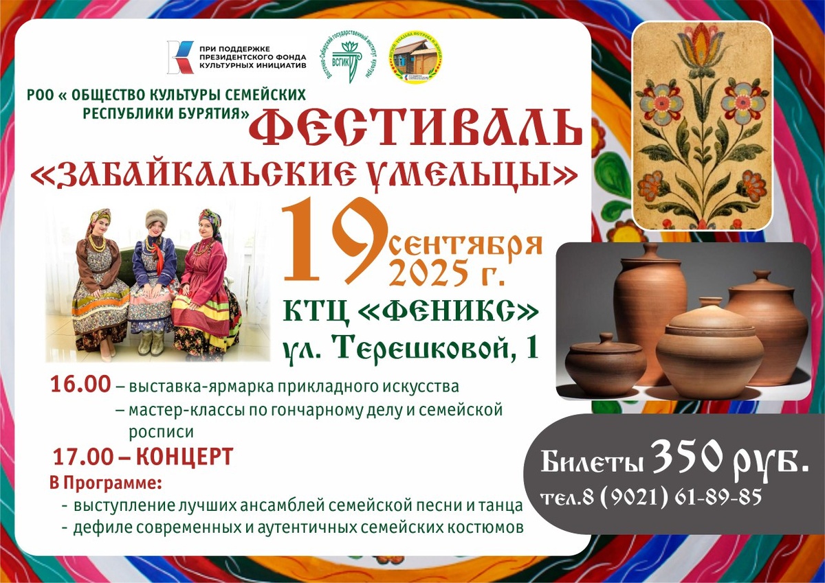 В Бурятии 19-20 сентября 2025 года пройдёт Фестиваль семейской культуры «ЗАБАЙКАЛЬСКИЕ УМЕЛЬЦЫ». В первый день Фестиваля - 19 сентября, мероприятия будут проходить на территории Концертно-театрального центра «Феникс» (Улан-Удэ, Терешковой, 1). В программе первого дня: выставка-ярмарка народных умельцев-мастеров, беспроигрышная лотерея, семейские угощения и народные игры. Вечером гостей ждет уникальная программа - концерт, на котором выступят лучшие семейские коллективы республики и будут продемонстрированы фееричные семейские костюмы и наряды. (Билеты на концерт можно приобрести с 14 августа на сайте: Улан-Удэ.кассы.ру). Второй день Фестиваля – 20 сентября, будет организован в семейской усадьбе старовера Петрова в селе Нижний Жирим в Тарбагатайском районе. В программе второго дня: знакомство с историей и культурой семейских, экскурсия и мастер-классы по семейским ремеслам. Здесь гости станут участниками весёлых народных гуляний, где познакомятся со старинными семейскими обрядами и отве