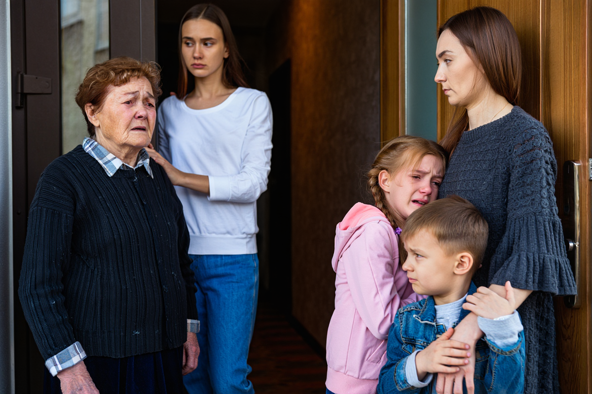 За её спиной стояли мои внуки — семилетний Артём и пятилетняя Полина. Они смотрели в пол, не поднимая глаз.
