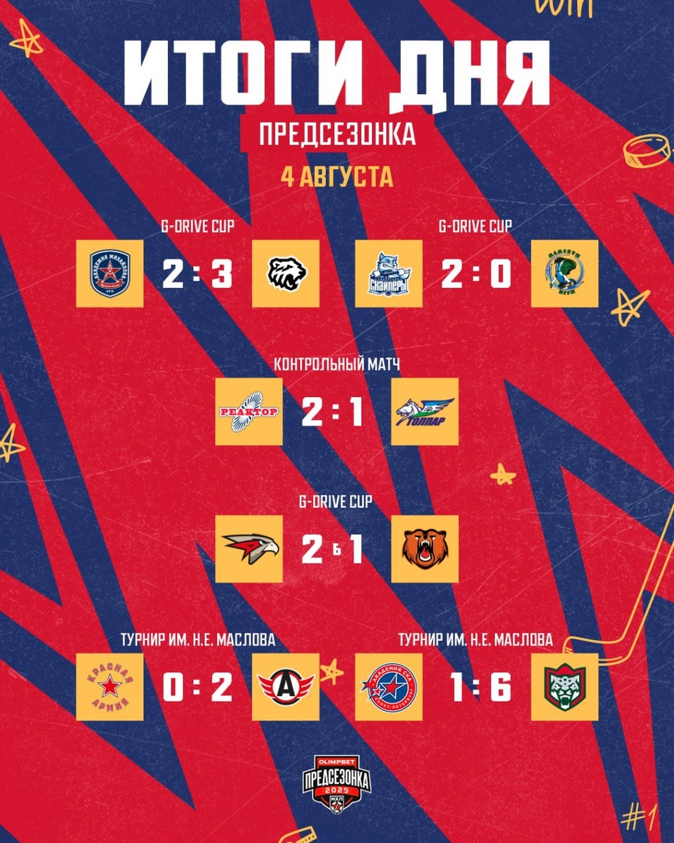🥅Предсезонка МХЛ🏒 Предсезонный матч 4 августа «Реактор» - «Толпар» 2:1 Турнир имени Н.Е. Маслова (Санкт-Петербург) 4 августа «Красная Армия» - «Авто» 0:2 «СКА-Юниор» - «Ирбис» 1:6 5 августа «Красная Армия» - «Ирбис» 12:00 «СКА-Юниор» - МХК «Динамо СПб» 19:00 G-Drive Cup (Омск) 4 августа «Академия Михайлова» - «Белые Медведи» 2:3 «Сибирские Снайперы» - «Мамонты Югры» 2:0 «Омские Ястребы» - «Кузнецкие Медведи» 2:1(Б) 📸МХЛ @nhockey