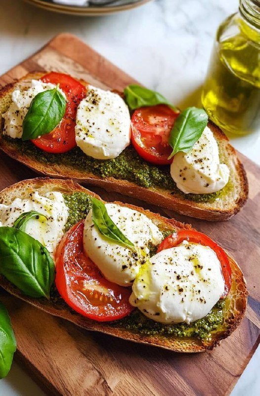 Нужно подсушить черный хлеб, смазать его песто, далее выложить томаты нарезанные кубиком, посолить и выложить сверху моцареллу. Идеально подавать такие бутерброды с аперолем ну или кофе.