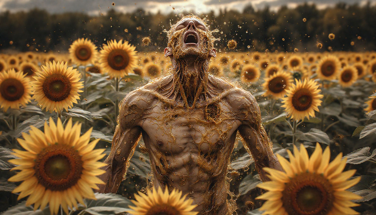 Мир был ослепительно ярок. Подсолнухи стояли, как молчаливые свидетели. Я шел прямо к центру поля, к черному алтарю моего проклятия. Каждый шаг был пыткой. Мое тело раздувалось на ходу. Ноги становились столбами, руки — бесформенными кувалдами. Я чувствовал, как трещит одежда, как кожа натягивается до предела.