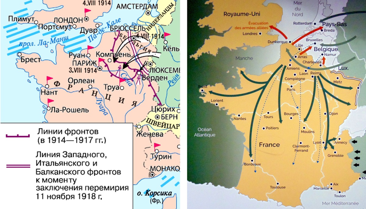 Для наглядности вот вам карты в ответ. Слева – боевые действия на Западном фронте Первой мировой в 1914-18 гг. (карта, кстати, из учебника Мединского), а справа – события на том же Западном фронте, но Второй мировой, в мае – июне 1940 года. Почувствуйте