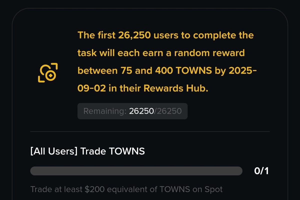 💰 Ещё одна прикормка от Binance Сегодня в 17:30 стартует новая промка от банана с токеном $TOWNS и в 20:00 с токеном $PROVE, где мы случайным образом сможем получить 75-400 $TOWNS и от 4 до 20 $PROVE. Что нужно сделать: ▪️ Регистрируемся на Binance 👈 и проходим KYC-1 (если нет аккаунта) ▪️ Подтверждаем участие ТУТ и ТУТ. ▪️ Делаем оборот на споте 200$+ в паре TOWNS/USDT и PROVE/USDT. Всего будет 26250 мест в промке TOWNS для старых юзеров и еще 26250 мест для новых, где за депозит 101$+ тоже раздадут рандомно по 75-400 TOWNS + 15к мест в промке PROVE. 😌Bybit (https://partner.bybit.com/b/43818) | Chat | Admin