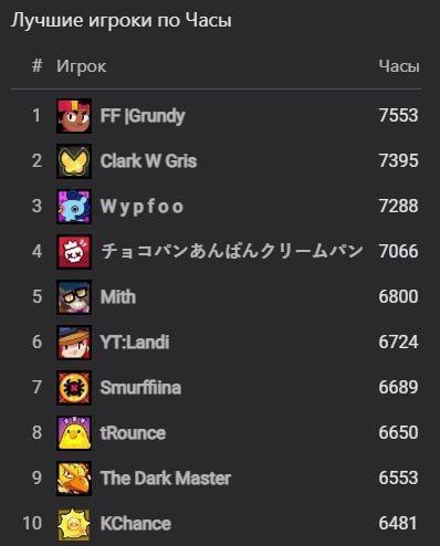 ⚡️ Топ-10 игроков по количеству часов в Brawl Stars