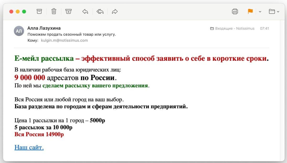 А ведь до нас дошла эта спам- рассылка с рекламой спам- рассылок