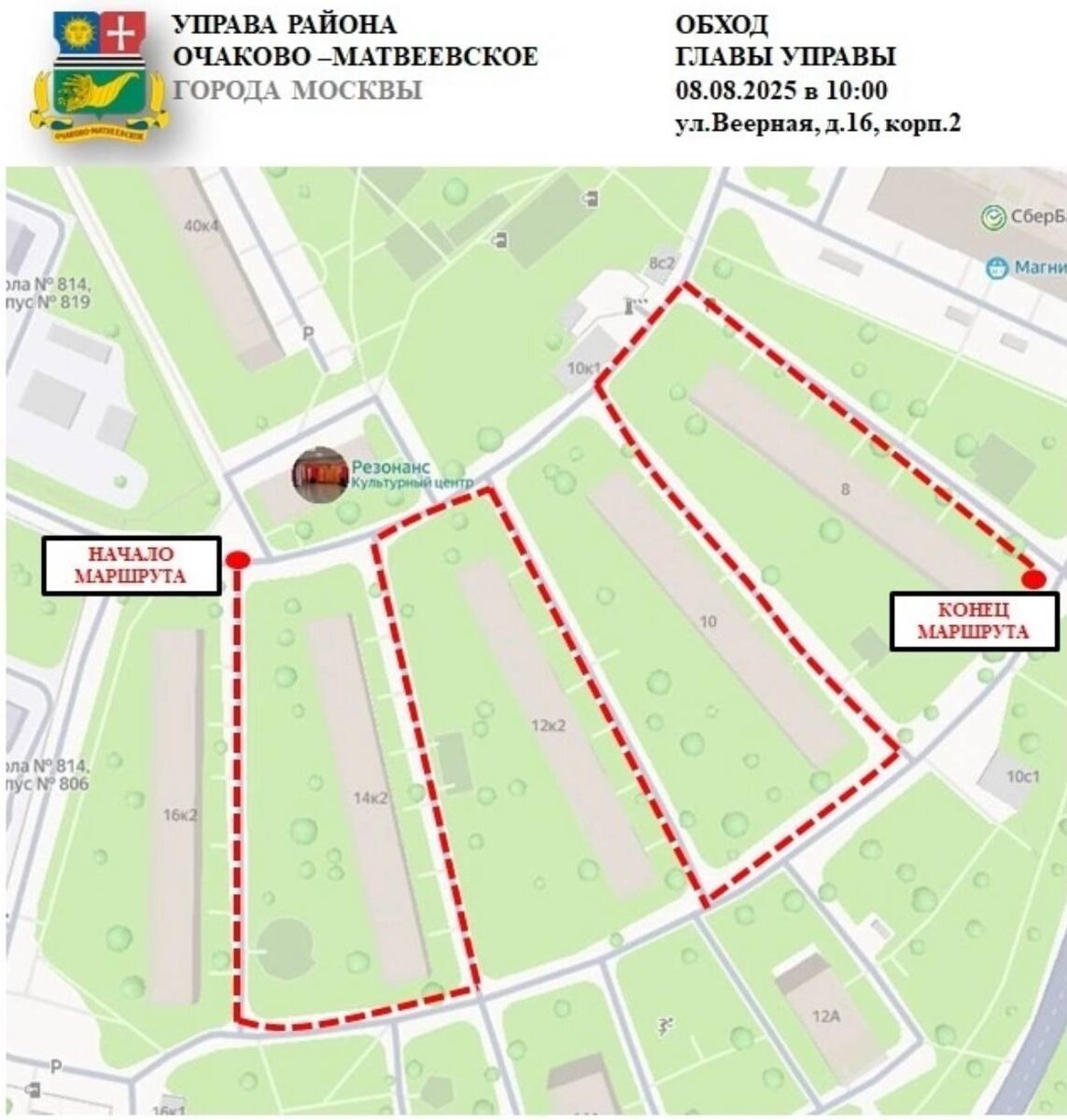 8 августа (пятница) в 10.00 глава управы района Очаково-Матвеевское Макаров Евгений Николаевич проведет обход территории 🗺 ул. Веерная, д. 16, корп. 2 ➡️ ул. Веерная, д. 8. Вместе с ним по маршруту пройдут заместители главы управы, представители ГБУ «Жилищник района Очаково-Матвеевское». @matveevkalive