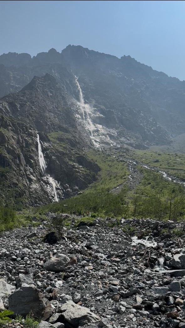 Пока мама любовалась видами ущелья, мы прошли максимально вперед до водопада Малый Зейгалан. К Большому Зейгалану близко подходить не рекомендуется, так как вместе с водой летят на огромной скорости большие обломки льда и камни. Поэтому не стоит рисковать и близко приближаться, чтобы случайно не получить от них удар. Но даже, близко не приближаясь, было видно, как летит с жутким ревом эта бурлящая смесь. Завораживающее зрелище. Ради этого стоило приехать сюда, несмотря на все трудности и страх. Это очень красиво, масштабно и просто невероятно. Стоя в ущелье, в окружении величественных гор, с ниспадающими водопадами зеркально-кристальной воды я пожалела только об одном – что я не художник.