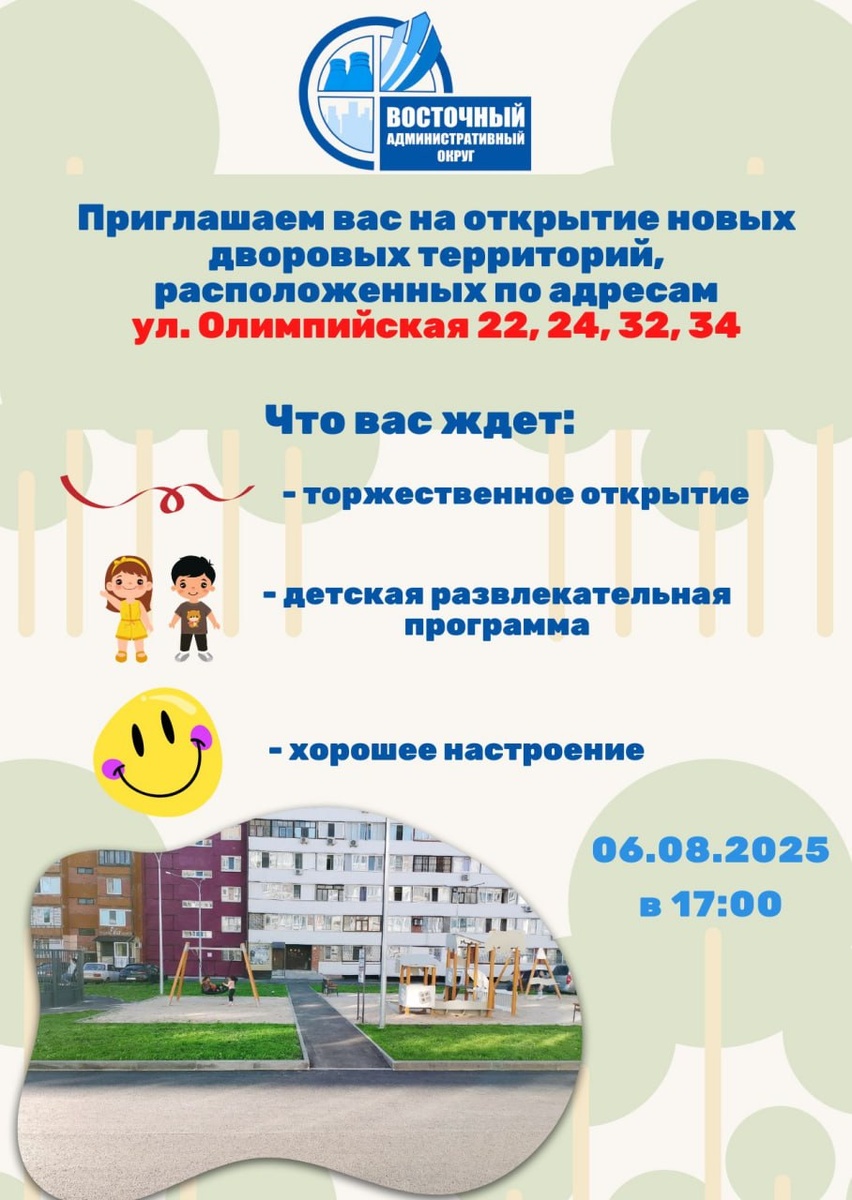 Управа Восточного округа приглашает на открытие дворов! 6 августа в 17 часов жителей Восточного округа ждут на торжественном открытии обновлённых дворовых территорий по адресам: ул. Олимпийская, 22, 24, 32, 34. Для участников будет подготовлена детская развлекательная программа и праздничная атмосфера, обеспечено хорошее настроение. Приходите всей семьёй!
