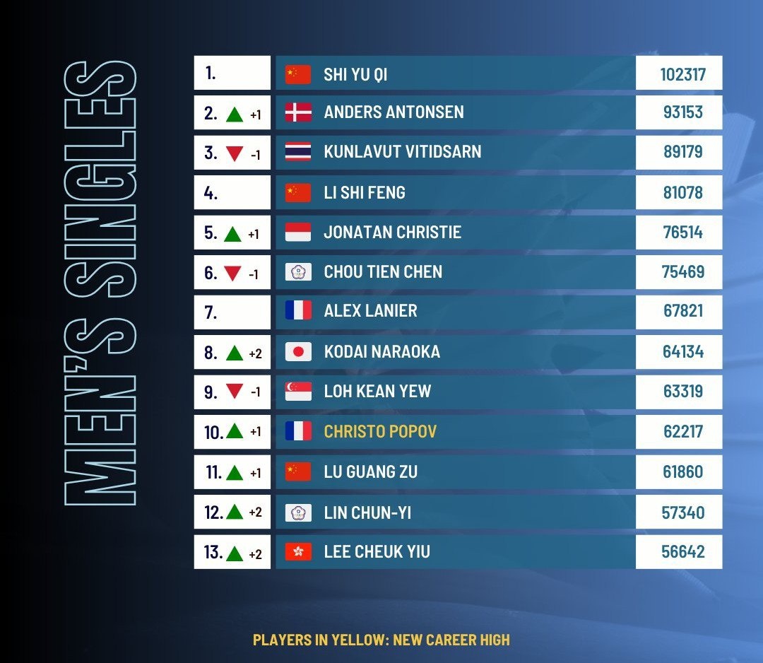 Обновленный рейтинг BWF на 5 августа 2025🏸 📊 Полный рейтинг на сайте BWF 🔸В августе нас ожидает Чемпионат мира, который пройдет во Франции с 25 по 31 августа🇫🇷 🔸С 12 по 15 августа в Саратове🛡 проводятся "Всероссийские соревнования, посвященные Первому космонавту Ю.А. Гагарину" 🔸С 27 по 30 августа состоится Lagos International Classics 2025🇳🇬, в котором примут участие Родион Алимов, Максим Оглоблин и Даниил Дубовенко 🔸С 29 до 31 августа в Нижнем Новгороде🛡 пройдут "Всероссийские соревнования памяти Ремизовой Л.Э." BadmintonOpen