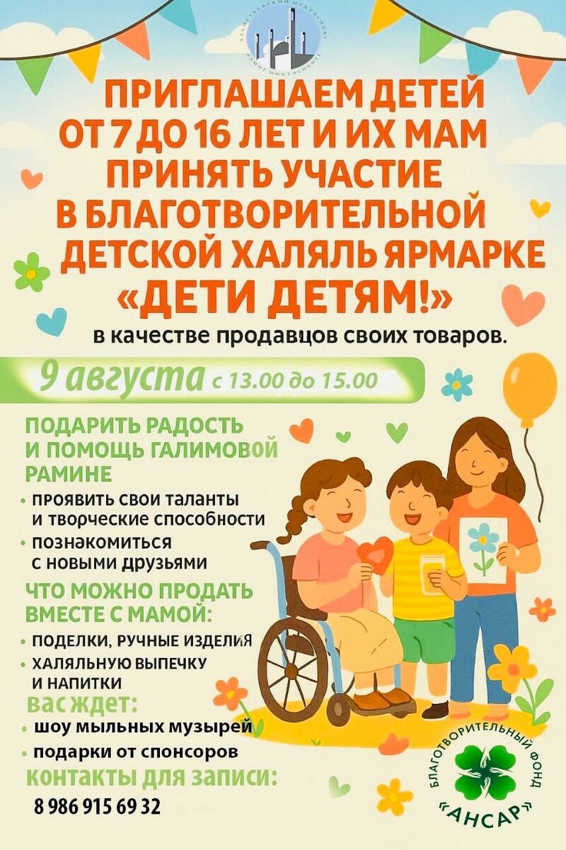 🎈Всем мира и добра! Приглашаем детей от 7 до 16 лет и их мам! Друзья, приглашаем вас принять участие в благотворительной детской халяль ярмарке «Дети детям!» в качестве продавцов своих товаров. 📅 Дата: 9 августа 🕒 Время: с 13:00 до 15:00 📍 Место проведения: Альметьевск, Центральная мечеть, стилобат Это замечательная возможность: ✨ Подарить радость и помощь Галимовой Рамине ✨ Проявить свои таланты и творческие способности ✨ Познакомиться с новыми друзьями 🌿Что можно продать вместе с мамой: ✔Поделки, ручные изделия ✔Халяльную выпечку и напитки 🎁Вас ждёт: 🎈 Выступление хазрата с вагазом 🎈 Шоу мыльных пузырей 🎈 Подарки от спонсоров 💌 Контакты для записи: 📲 +7 986 915-69-32 Приходите мамочки со своими детьми ! Давайте сделаем этот день по-настоящему добрым и тёплым .
