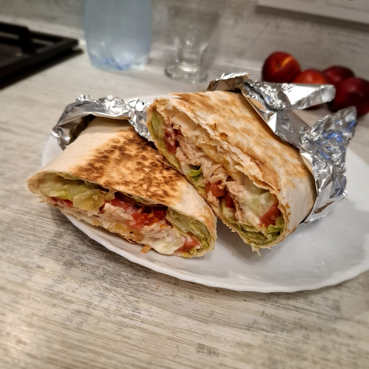 Вкусный и сытный обед или ужин! - лаваш - помидоры - огурцы - сыр - салат листовой (Айсберг) - куриная грудка - сметана - майонез - чеснок - специи * обжарить курицу на масле в специях * нарезать все небольшими кусочками * приготовить соус - сметана и майонез 3/1 и чеснок на тёрке * выложить все на лаваш и погреть на сухой сковороде до хрустящей корочки