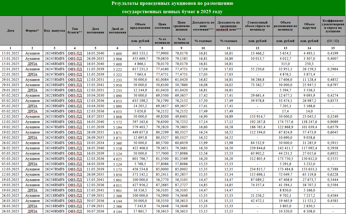 За январь-сентябрь 2025 года: Минфин получил с рынка ОФЗ на 389 млрд руб больше, чем выплатил инвесторам. Но эта цифра меньше, чем был баланс за январь-август - в сентября выплаты превысили выручку от первичных размещений. За январь-октябрь Минфин РФ разместил следующие выпуски ОФЗ, выручив 4 466 млрд руб. При этом в январе было выплачено: 628 млрд руб в феврале: 71.5 млрд руб. в марте: 469 млрд руб. в апреле: 235 млрд руб. в мае: 177 млрд руб. в июне: 409 млрд. руб. в июле: 697 млрд. руб. в августе: 74 млрд. руб. в сентябре: 515 млрд. руб. в октябре: 297 млрд. руб.