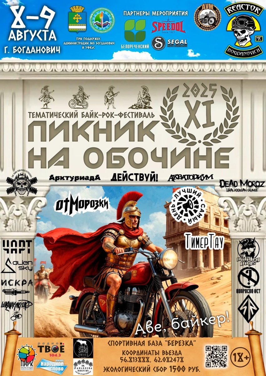 🔁 Дальняк.рф™: SALVETE, AMICI! Приветствуем вас на грандиозном рок-фестивале, где мощь древних богов и гладиаторов встречается с энергией рока и свободы! Готовы ли вы погрузиться в атмосферу древнего Рима, приправленную ревом моторов? Тогда вам к нам! Как в великом Колизее собирались лучшие гладиаторы, так и здесь соберутся лучшие рок-исполнители со всей страны, чтобы подарить вам незабываемых впечатлений! Два огненных дня, наполненных: * Эпическими рок-выступлениями * Рок дискотека * Захватывающими конкурсами гладиаторов современности * Древнеримскими развлечениями * Конкурс костюмов и украшения байков в тематике фестиваля Координаты фестивальной арены: 56.813888, 62.082478 Экологический сбор: 1500 рублей Въезд колесницы (автомобиля): 1000 рублей Вход для юных гладиаторов до 14 лет в сопровождении взрослых - Бесплатный! Пусть дух Цезаря вдохновляет вас, а мощь римских легионов придаст сил для участия в нашем фестивале!