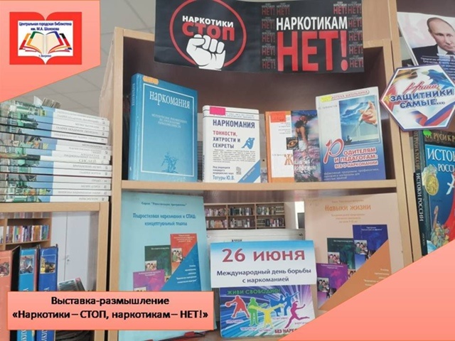 В центральной библиотеке имени М.А. Шолохова города Зверево оформлена выставка-размышление «Наркотикам – стоп. Наркотикам – нет!», посвященная Международному дню борьбы с наркоманией и незаконным оборотом наркотиков. На выставке представлены книги, брошюры, фотографии, плакаты и статьи из журналов, посвященные глобальной угрозе здоровью населения страны и национальной безопасности – наркозависимости. «Актуальность наркомании во всем мире связана с тем, что зависимость от наркотиков возникает гораздо чаще и быстрее, чем от алкоголя. Наркоманию начинают сравнивать с войной, потому что она уносит немало человеческих жизней. В основном это молодежь и подростки», — отметили библиотекари. Напомним, ранее сообщалось о том, что в Зверево прошла Неделя профилактики употребления наркотических средств, сообщается на официальном сайте центральной городской больницы. В течение недели медицинские работники напоминали горожанам о том, что наркозависимость — одна из серьезных проблем современного