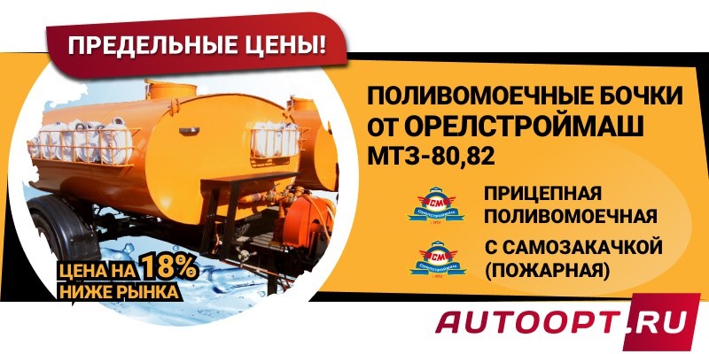 АвтоАльянс представляет вашему вниманию поливомоечные бочки от ОРЕЛСТРОЙМАШ с 18% скидкой от среднерыночной цены! ☑️ Бочка МТЗ-80,82 прицепная поливомоечная 🛒 Код товара: 424692 по ссылке 💰 Цена со скидкой: 512 830 руб. (вместо 598 300 руб.) · Моет, поливает, тушит пожары · Вместимость цистерны - 3,5 м³ · В комплекте: емкость на тракторном шасси, насосное оборудование, комплект разводки с распылителями и ЭПСМ. ☑️ Бочка МТЗ-80,82с прицепная поливомоечная с самозакачкой (ПОЖАРНАЯ) 🛒 Код товара: 864794 по ссылке 💰 Цена со скидкой: 539 395 руб. (вместо 629 300 руб.) · Моет, поливает, тушит пожары · Вместимость цистерны - 3,5 м³ · В комплекте: ёмкость на тракторном шасси, насосное оборудование, комплект разводки с распылителями, всасывающий рукав 4,5 м с фильтром на конце, пожарный раскатной рукав 20 м с пластиковым стволом для пожаротушения и ЭПСМ. ⚠️ Количество ограничено! Не упустите редкую возможность сэкономить на востребованном оборудовании! ▶ Все для МТЗ