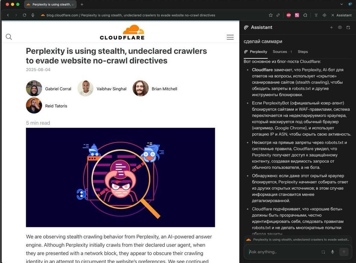 🌐 Новая эра браузеров и ИИ: как нейросети учатся "смотреть через плечо" Раньше ИИ просто парсил сайты — но это всё сложнее. Теперь почти везде стоят защитные барьеры: robots.txt, капчи, антиботы, Cloudflare и другие сервисы блокируют любые подозрительные запросы. И вот что происходит: всё больше людей уходит от классического поиска в пользу ИИ, который помогает искать, анализировать и отвечать напрямую. Но как ИИ получить нужные данные, если сайты ставят заслоны? Ответ — новый тренд: ИИ не обходит защиту, а живёт внутри браузера вместе с пользователем. Когда ты открываешь сайт — ИИ "сидит рядом", видит то же, что и ты, анализирует контент и контекст, не вызывая подозрений и не попадая под блокировки. Поэтому сейчас активно появляются AI-браузеры и расширения — Perplexity, Genspark, Dia, а скоро у ChatGPT тоже будет свой такой инструмент. Их задача — не заменить Google, а использовать твой реальный пользовательский трафик, чтобы понимать, что происходит в сети. ⚠️ Недавно Cloudf