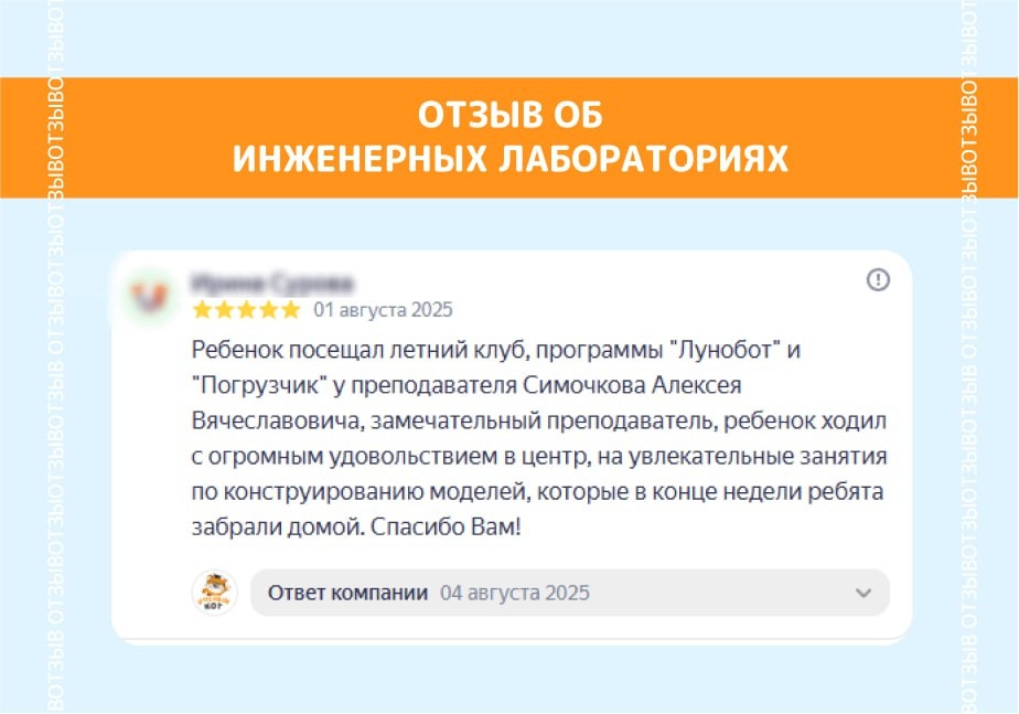 🌟 Вот такой тёплый отзыв получили о нашей летней программе инженеров! Спасибо за вашу обратную связь. 🔧⚡️ С сентября стартуют регулярные занятия «Инженеры-изобретатели» - одно из популярных направлений филиалов м. Бабушкинская и м. Отрадное. Действуют годовые, месячные программы, а также разовые инженерные мастер-классы. Погружаемся в увлекательный мир техники, устройств конструкций, механизмов и машин. Разжигаем интерес и мотивацию к изучению физики, математики и it-технологий. 👉 Подробнее 👉 Расписание Забронировать место в группе можно уже сегодня! Узнайте подробнее у администраторов 📞 Позвонить +74959688647 📱 Написать в телеграм Ваши дети тоже занимаются у нас этим летом? Поделитесь впечатлениями в на яндекс картах — для нас это очень важно. 💬 #отзыв_учкот