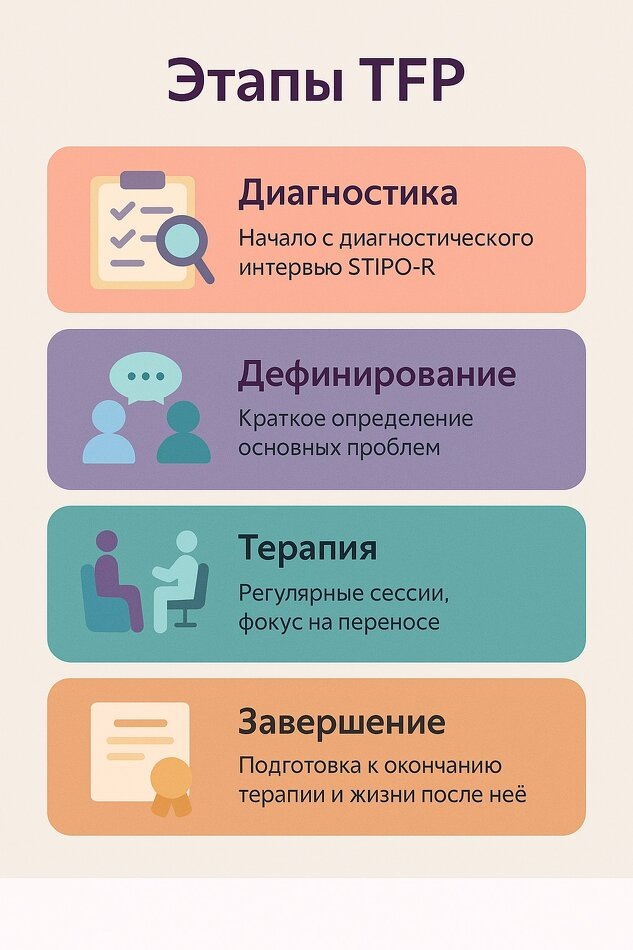 [p] [p]Какие этапы проходит клиент в TFP-терапии — от диагностики до завершения? Рассказываю, как метод работает с глубинной структурой личности, а не только с симптомами. Подходит при ПРЛ, нарциссических чертах и повторяющихся кризисах в отношениях. TFP (Transference-Focused Psychotherapy) — это психодинамический метод, разработанный специально для глубинной работы с расстройствами личности. Он особенно эффективен при пограничной и нарциссической организации, когда человек сталкивается с эмоциональной нестабильностью, страхом близости, резкими сменами самооценки и повторяющимися кризисами в отношениях. В отличие от поддерживающей терапии, метод TFP направлен на трансформацию самой структуры личности, а не только на смягчение симптомов. Это делает его подходящим при работе с клиентами, у которых выявлены признаки пограничной организации личности, а также при диагностированных случаях ПРЛ (пограничного расстройства личности) и нарциссического расстройства. Перед началом терапии проводит