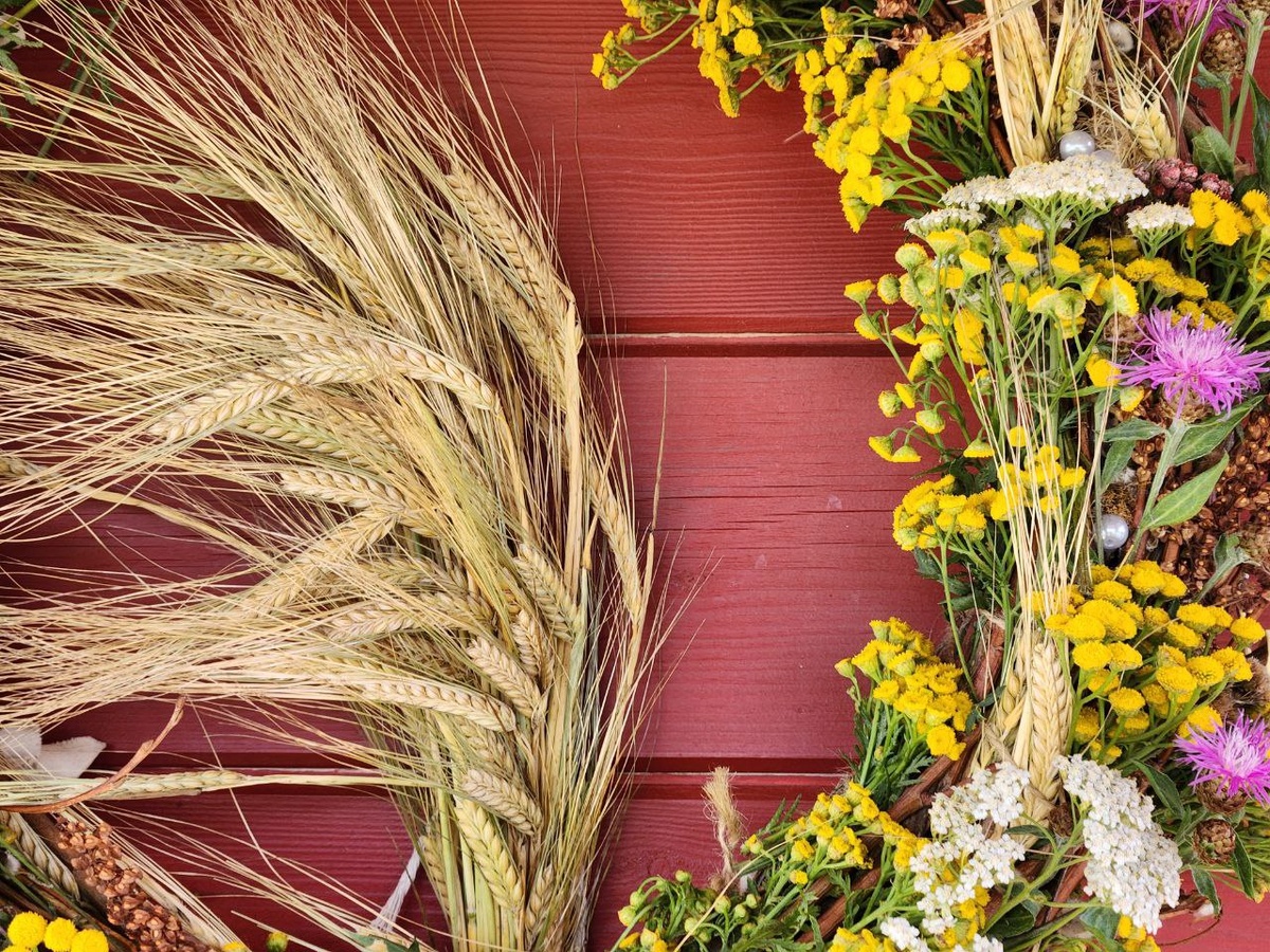 В венке — пижма с её золотистыми пуговками, белый тысячелистник, который даже в сухом виде остаётся красивым, полевые цветы и колоски — то ли ржи, то ли пшеницы. Нашла их в поле, недалеко от дома, гуляя, как в детстве: по пути из леса, вдыхая запах зрелого лета. Теперь венок висит на веранде, на фоне стены цвета «княженики» — глубокого, насыщенного красного, как спелые ягоды в бабушкином варенье. Он живёт с домом — дышит вместе с ним, отражая смену времён года, погоды, настроения. Это