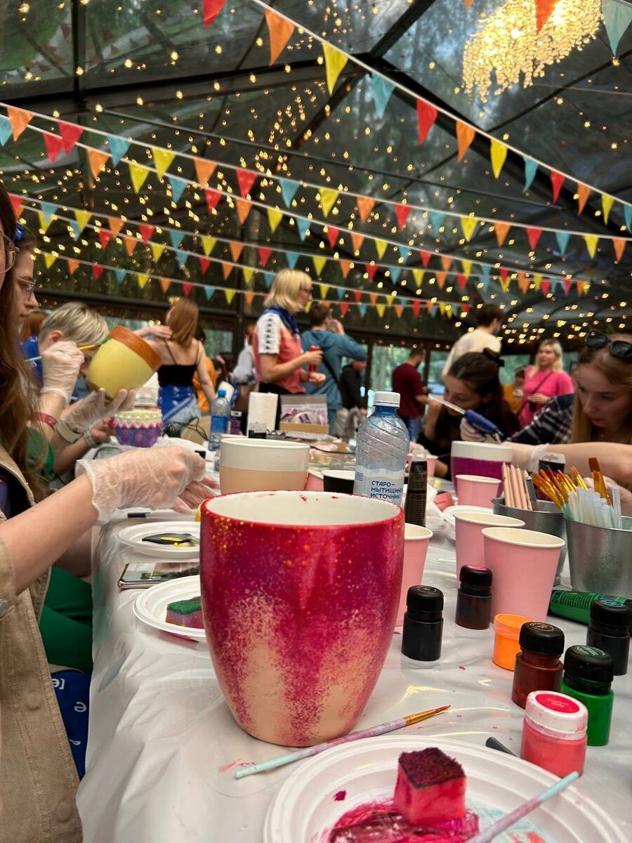 Это была настоящая радость — тёплая, почти семейная. На одном расписывали керамические кашпо: цветочные узоры, круженая нежность и россыпь сияющих бусин! 🌸