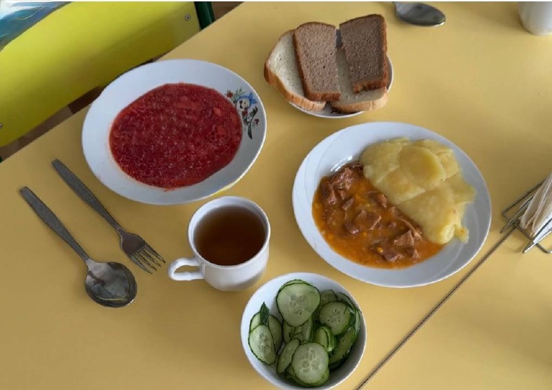 Сегодня на обед в саду : борщ, салат из огурчиков, пюре с говядиной и яблочный сок