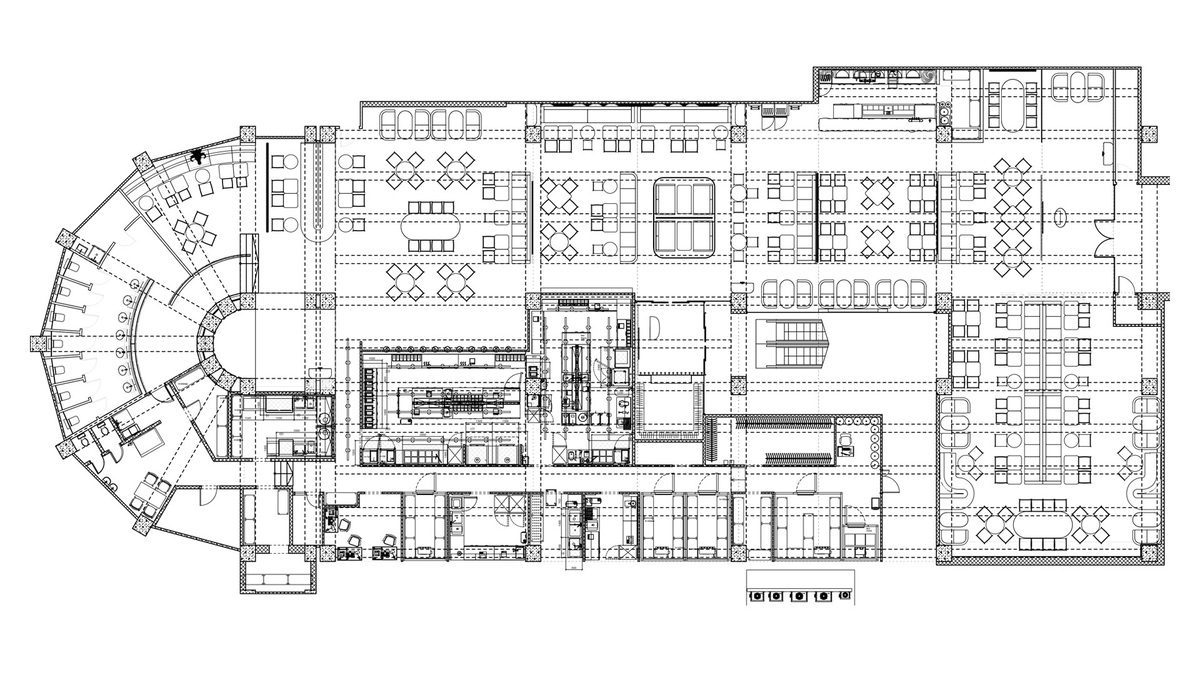 Идеальный план этажа может гарантировать успех проекта. План этажа БЫК раскрывает продуманную стратегию зонирования, которая сыграла центральную роль в формировании концепции интерьера. Учитывая первоначальные проблемы пространства — наклонный пол, низкие потолки и отсутствие естественного света — планировка была тщательно разделена на несколько обеденных зон, каждая со своим характером и атмосферой. От изогнутых полуприватных кабинок в закругленной секции до длинных общих столов и барных зон, каждая зона была специально спроектирована для удовлетворения различных предпочтений в еде и размеров групп. Это зонирование стало основой процесса проектирования, что позволило Futuris Architects разработать четыре отдельных зала, каждый из которых был разработан с учетом особого освещения, текстур и настроений — в конечном итоге воплотив в жизнь смелую и захватывающую концепцию БЫК.