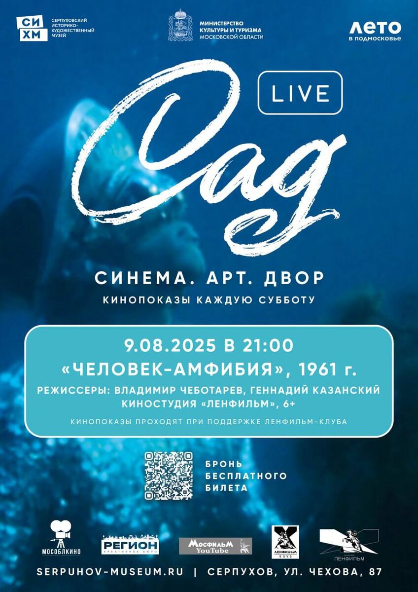 ✨ Кино под открытым небом 🐠 Внимание, любители классики советского кино! Спешим сообщить — появилась новая ссылка на бронирование билетов на легендарный фильм «Человек-амфибия»! https://clck.ru/3NUqL6 ❗️Успевайте,билетов ограниченное количество 🥰Захватите на просмотр с собой пледы 🚫 Возраст: 6+ 📆 09.08.2025 🕒 21:00 🏢 Серпуховский историко-художественный музей 📍 Московская обл., г. Серпухов, ул. Чехова, д. 87 ⭐Разместить публикацию ⭐Поддержать канал голосом 💰 Стань курьером в Серпухове – твой доход, твое время! ✅ Мероприятия Серпухов https://dzen.ru/id/66f01c6eb4c6fe60c9ca1608 http://vk.com/serpukhov_events http://dzen.ru/serpukhov_events