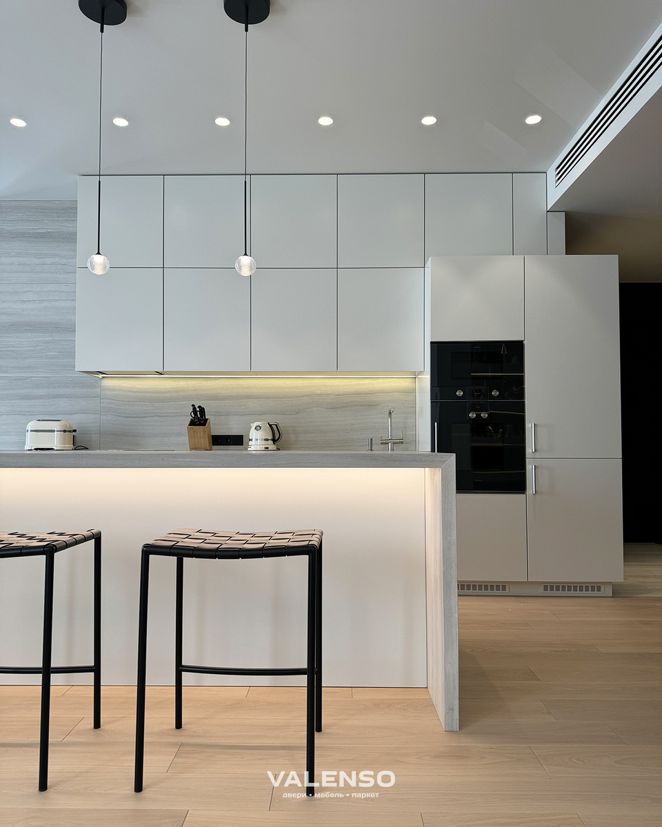 Кухню в этом интерьере мы изготовили на нашем собственном производстве по авторскому проекту студии Rymar Studio. Фасады выполнены в белой матовой эмали, а нижняя часть снабжена интегрированными ручками — решение, которое поддерживает чистую геометрию и визуальную лёгкость. Внутреннее оснащение — система Legrabox от Blum, обеспечивающая надёжность и плавность хода ящиков. Часть хранения интегрирована в остров — он не только функционален, но и стал визуальным акцентом. Его П-образная столешница выполнена из того же материала, что и фартук и основная рабочая поверхность, благодаря чему кухня выглядит цельно и сдержанно. Для встроенной вытяжки мы предусмотрели две аккуратно вписанные вентиляционные решётки. Вся композиция поддержана лаконичным светом, натуральными оттенками и продуманной эргономикой.