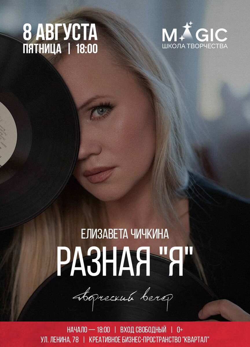 Сольный концерт Елизаветы Чичкиной «Разная Я» 🗓️ 8 августа, 18:00 📍Квартал, Ленина 78 На концерте прозвучат хиты и современные композиции российских и зарубежных исполнителей в различных музыкальных стилях: фолк, рок и поп. Вход свободный 🏷️ #8августа25