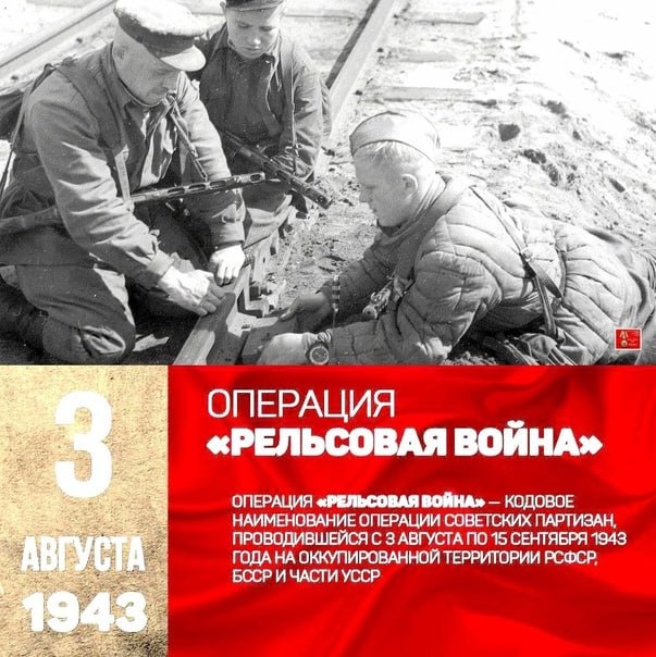 3 августа 1943 года — началась партизанская операция «Рельсовая война» Операция советских партизан под названием «Рельсовая война» в ходе Великой Отечественной войны началась 3 августа 1943 г. Она проводилась на протяжении полутора месяцев на оккупированной территории РСФСР, Белоруссии и Украины. В результате было взорвано порядка 215 тысяч рельсов, что затруднило снабжение отступающих немецко-фашистских войск. В годы войны одной из частей антифашистского движения советского народа являлись партизаны. Борясь с фашистскими захватчиками своими методами, партизаны во многом способствовали выведению из строя вражеской техники и общей победе советских войск. В 1943 году партизанское движение предприняло ряд операций по разгрому и минированию железнодорожных коммуникаций противника. Всего к выполнению первой такой операции были привлечены 167 бригад и отдельных отрядов. В них входили белорусские, ленинградские, калининские, смоленские, орловские и часть украинских партизан. Операция «Рель