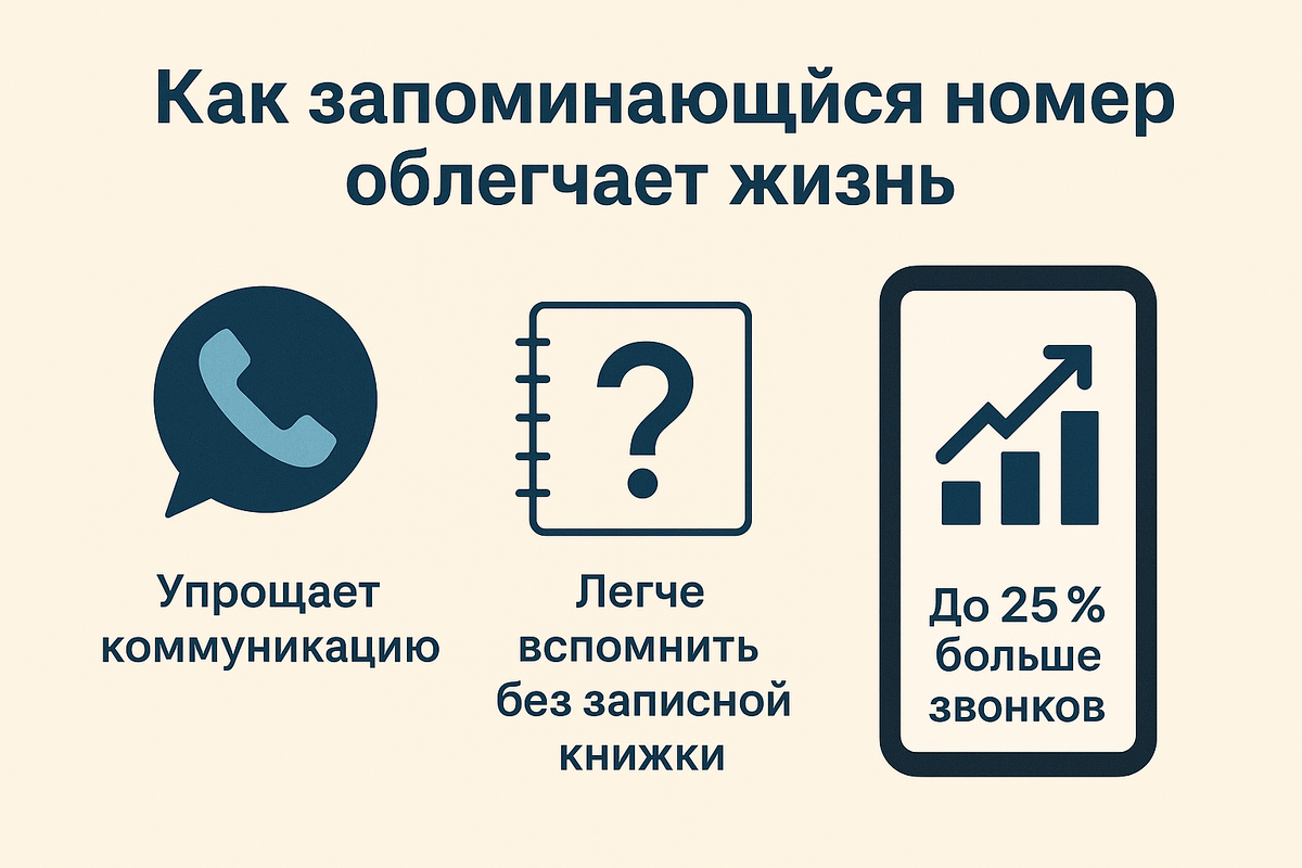 Наверняка вы хоть раз ловили себя на том, что напеваете рекламный номер телефона – например, легендарное “8-800-555-35-35” прочно засело в голове у многих. Ничего удивительного: повторяющиеся цифры сделали его максимально простым для запоминания. Почему же “красивые” номера так легко остаются в памяти и действительно ли они могут облегчить жизнь? Давайте разберёмся в практической пользе запоминающихся комбинаций. (Возможная иллюстрация: смартфон с отображённым на экране простым, легко читаемым номером телефона – например, все цифры одинаковые или образуют последовательность. Рядом может быть другой телефон с хаотичным набором цифр, показывая разницу в восприятии.) Запоминающийся номер телефона существенно упрощает общение, потому что его не нужно повторять по нескольку раз или искать в записной книжке. Простая комбинация вроде 111-11-11 или 123-45-67 мгновенно откладывается в памяти, тогда как случайный набор цифр забывается через минуту. Мозг автоматически цепляется за повторяющиеся