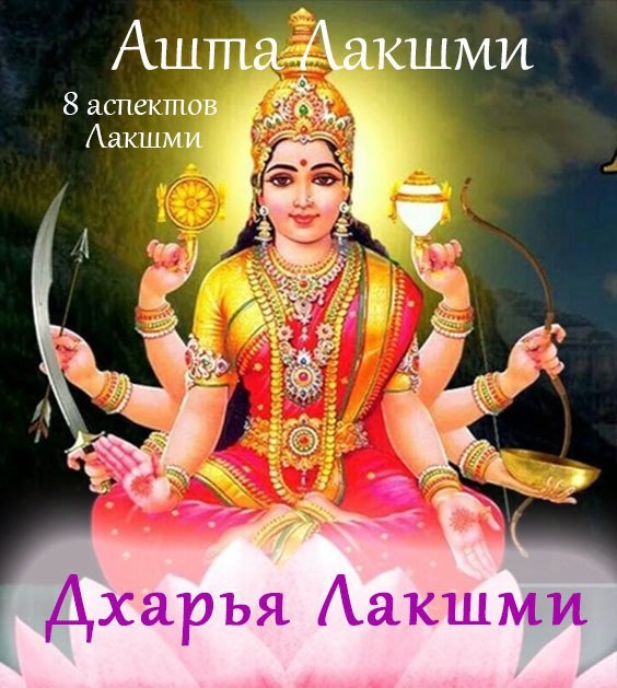 Дхайрья (Вира) Лакшми – дает отвагу противостоять трудностям, врагам. Дает способность изгонять сущностей. По своему проявлению силы похожа на Дургу. Помогает избавляться от страхов и следовать по своему Пути. Помогает очищать карму. Дает способность мудро распоряжаться своей жизнью, не создавая новую неблагую карму. jayavaravarṇini vaiṣṇavi bhārgavi mantrasvarūpiṇi mantramaye . suragaṇapūjita śīghraphalaprada jñānavikāsini śāstranute .. bhavabhayahāriṇi pāpavimocani sādhujanāśrita pādayute . jayajaya he madhusūdana kāmini dhairyalakṣmi sadā pālaya mām .. 3.. Слава тебе, светлотелая, Вайшнави, дочь Бхригу, Принявшая облик мантр, состоящая из мантр, Почитаемая сонмами богов, быстро дарующая награду. Взращивающая знание, восхваляемая священными писаниями Уничтожающая страх материального существования, освобождающая от грехов, Окруженная добродетельными людьми Слава, слава тебе, возлюбленная Мадхусуданы, Дхаирья-Лакшми, всегда оберегай меня!