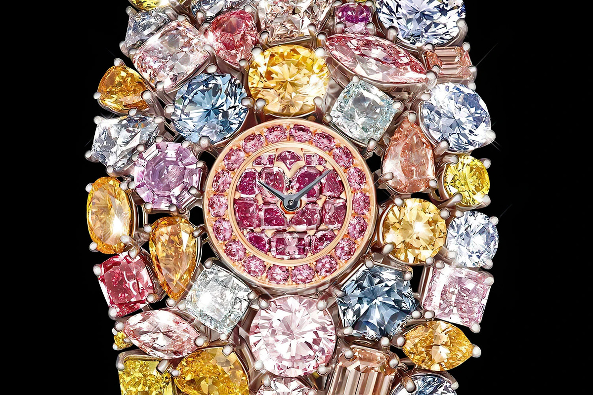 Женские ювелирные часы, изготовленные британским ювелирным домом Graff Diamonds в 2014 году. Корпус и браслет изготовлены из платины и украшены разноцветной инкрустацией из редчайших цветных бриллиантов с разнообразной огранкой. Циферблат, расположенный в центре, украшен по кругу камнями светло-розового цвета. За ним скрывается кварцевый механизм с модулем индикации текущего времени (часы и минуты). Стоимость часов на момент создания оценивалась в 55 миллионов долларов США. 2. Graff Fascination