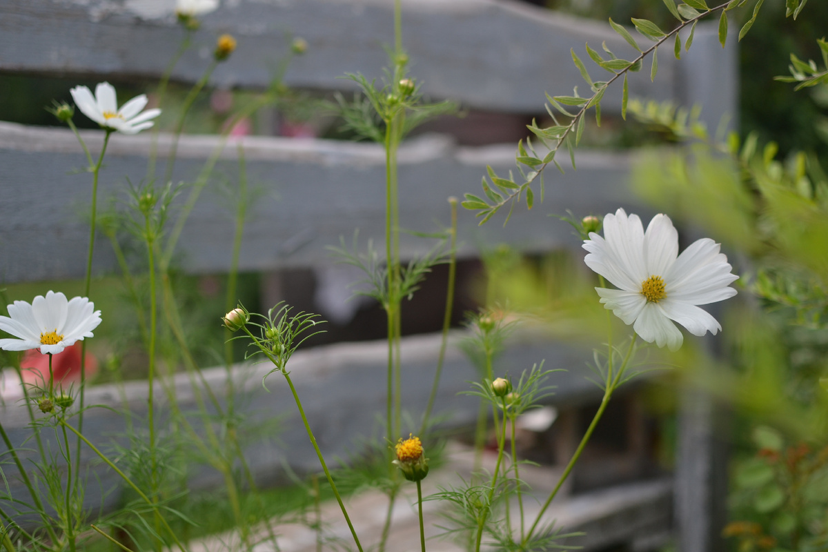 Мне нравится сажать космею так, чтобы она была как будто любопытная девчонка. Выглядывает так из-за шторки, когда к родителям пришли гости, хмурит носик, рыскает внимательными глазками. Я посадила одну за скамейку так, что она становится видна, когда обходишь клумбу вокруг. Сквозь широкие проемы между досками торчит своей светлой головкой.