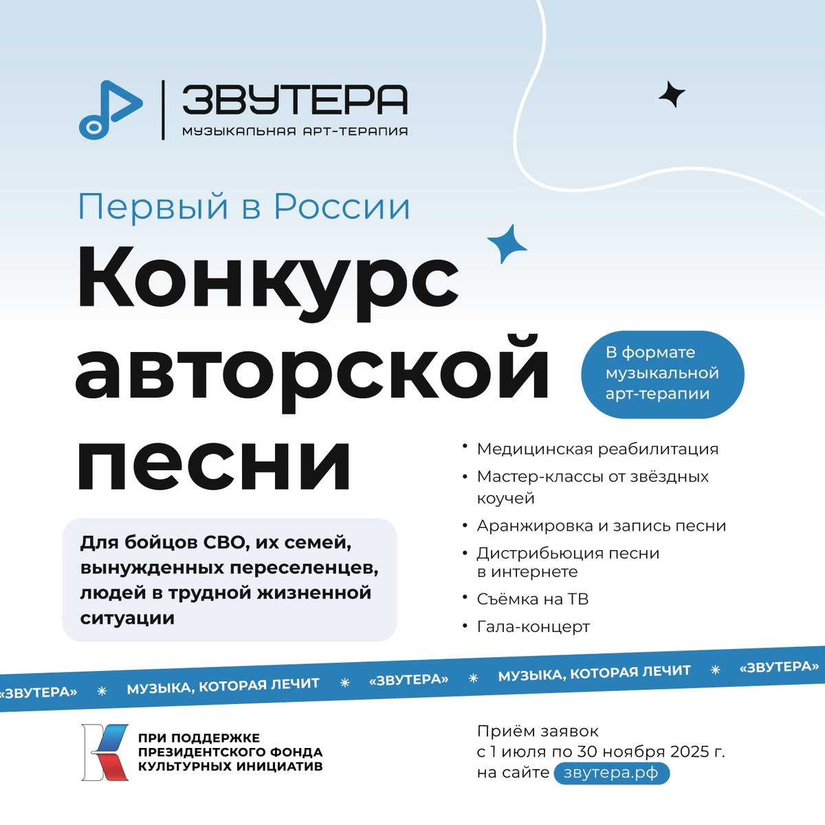 Участников ждут мастер-классы от лучших музыкальных экспертов страны, профессиональная запись песен, съёмки телесюжетов. В России стартует первый конкурс авторской песни для участников СВО, их близких, вынужденных переселенцев и людей в трудной жизненной ситуации. Проект называется «Звутера», он реализуется при поддержке Фонда культурных инициатив. Миссия конкурса - звуковая терапия, способствующая исцелению через творчество. Участники будут соревноваться в двух номинациях: Лучшая песня (для конкурсантов до 18 лет) и Лучшая песня, музыка, текст (для участников старше 18 лет). Заявки принимают с 1 июля. До 30 ноября все участники, прошедшие отбор, смогут попасть на мастер-классы от музыкальных экспертов, композиторов. - Финалистов конкурса ждут очные мастер-классы и запись песен в профессиональной студии в Тольятти. Гала-концерт конкурса пройдет в муниципальном автономном учреждении КЦ «Автоград» – одном из самых больших культурных центров Поволжья. Все финалисты примут участие в запис