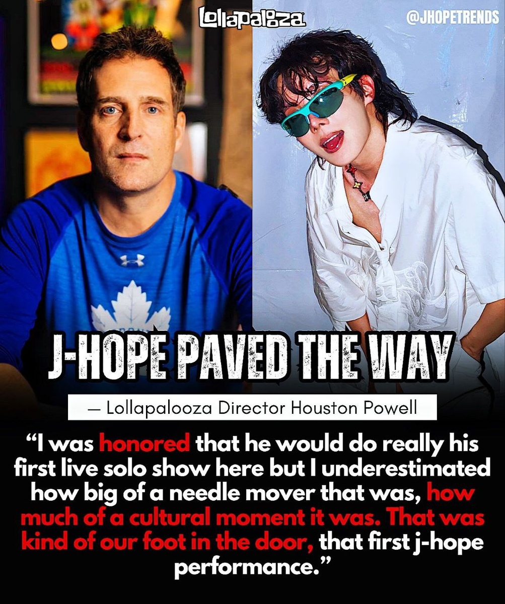 🐾 Хьюстон Пауэлл, директор фестиваля Lollapalooza, высоко оценил историческое выступление Джей-Хоупа, заявив, что это был поворотный момент, который превзошёл ожидания, и что дебютное сольное выступление Джей-Хоупа на фестивале стало "культурным событием", которое открыло дорогу будущим к-поп артистам. Он также отметил: Для меня было честью, что он дал своё первое живое сольное выступление здесь, но я недооценил, насколько сильное влияние это оказало, каким масштабным культурным событием это стало. То первое выступление Джей-Хоупа стало для нас своего рода прорывом. cr.junghoseokace #JHOPE @kumihobts