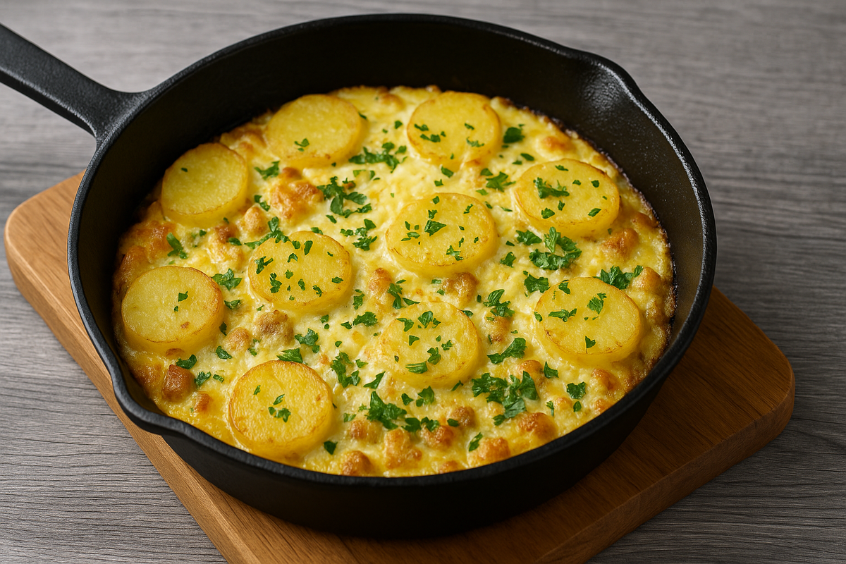 Такой омлет невозможно спутать с чем-то ещё: он пахнет жареной картошкой, расплавленным сыром и тёплым утром на даче. Это не тот омлет, который подают в модных кафе с микрозеленью. Это — домашний, душевный завтрак, который легко становится обедом.
