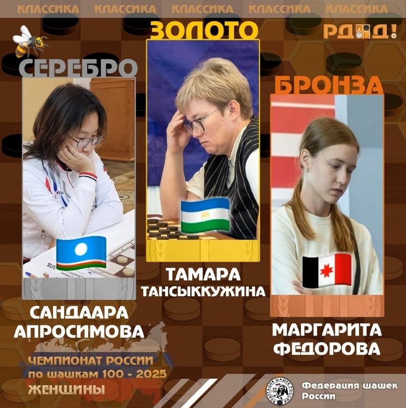 На чемпионате России по стоклеточным шашкам в Уфе стали известны первые победители. В Уфе продолжается чемпионат России по стоклеточным шашкам. В классической программе золотыми триумфаторами стали уфимские гроссмейстеры. Как сообщили в пресс-службе шашечного клуба «Башкортостан», весь призовой пьедестал в мужском турнире завоевали шашисты из Башкирии — Айнур Шайбаков, Александр Георгиев и Марсель Шарафутдинов. Среди женщин победу одержала семикратная чемпионка мира Тамара Тансыккужиной. Ее победа в заключительной девятой партии турнира позволила догнать по очкам прошлогоднюю чемпионку России Сандаару Апросимову и опередить ее по дополнительным критериям. Для легендарной спортсменки это девятый рекордный титул чемпионки России в классической программе. Ранее «Башинформ» сообщал, что спортсмены из Башкирии завоевали медали на чемпионате мира по мас-рестлингу.