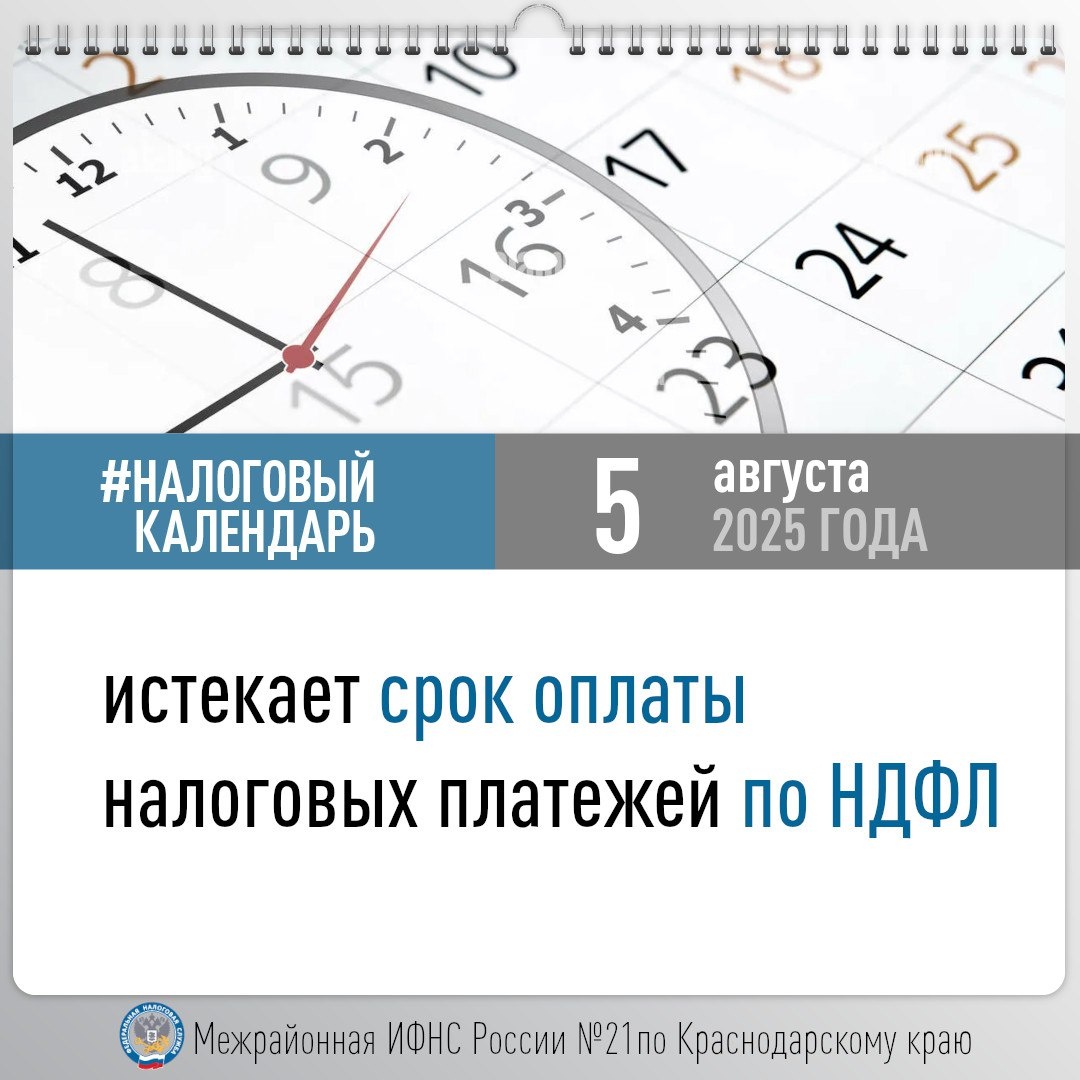 🚙 5 августа истекает срок оплаты налоговых платежей по НДФЛ