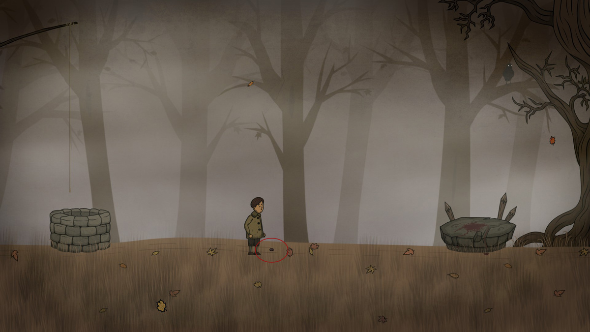 Собираем 4 гриба, брат замечает прекрасную бабочку. Проходим направо, к дому. Брата похищают. Смотрим в окно, главный герой падает. Берём выпавший гриб, ложем его на пенёк.